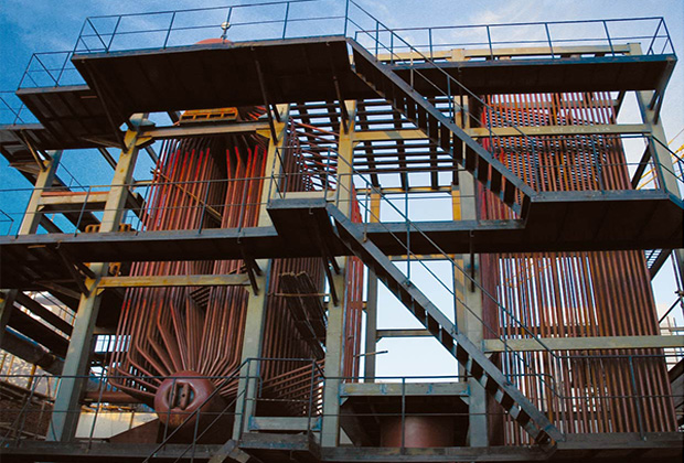 該型鍋爐結構布置簡單、緊湊。鍋爐本體由燃燒設備、給煤裝置、布風係統、高溫旋風分離器、對流管束、省煤器、空氣預熱器、鋼架、扶梯、爐牆等組成。爐膛由水冷壁構成,可在較短時間內啟、停鍋爐。該鍋爐具有一定的負荷調節能力,自動化程度高,產品運行穩定。該鍋爐具有高效、節能、環保等特點該型鍋爐采用床上木柴、木炭點火方式。采用高溫旋風分離器裝置,分離裝置布置在爐膛出口,分離器入口煙溫850-950℃。zaifenliqixiabubuzhilefanliaozhuangzhi。fenliqixialaidefeihuijingfanliaozhuangzhisonghuilutangjixuranshao。jingguofenliqifenlideyanqicongfenlichukoutongxiangshangliujingshuipingyandaojinruweibuyandaojiareweibushouremian。gaixingguolucaiyongliuhuachuangranshaojishu,meizhongshiyingxingguang,keranyongwuyanmei、煙煤、褐煤、貧煤、煙矸石等。采用低溫燃燒並可進行爐內脫硫處理,有利於環境保護,符合國家的環境保護政策。