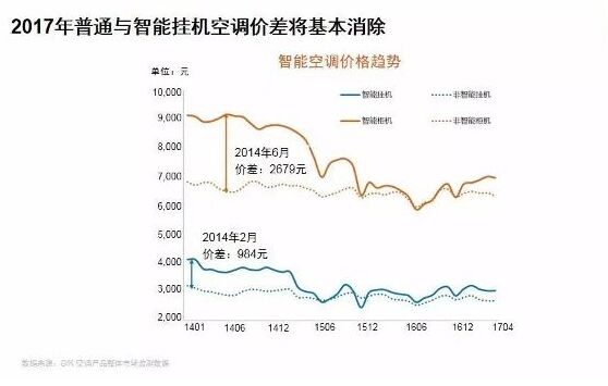 中國空調行業已加速向互聯網轉型 2014年,中國普通掛機空調與智能掛機空調價差近千元,櫃機價差更是超過2500元,而到2017年價差已經基本消除。