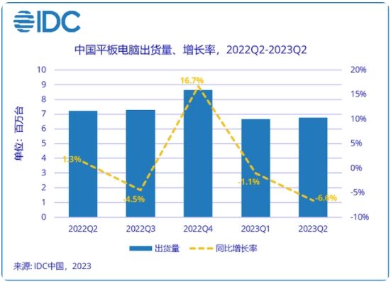 國際數據公司(IDC)最新平板電腦季度跟蹤報告顯示,2023年第二季度,中國平板電腦市場出貨量約677萬台,同比下降約6.6%,其中消費市場同比下降7.2%;商用市場同比增長0.6%。從廠商看,該季度市場份額前三名分別是蘋果、華為和小米。該季度國內平板電腦市場均價為2881元,環比上一季度下降1.7%。