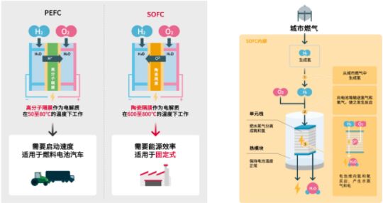 根據使用的電解質和工作溫度進行燃料電池的類型劃分。FCEV(燃料電池汽車)中所使用的燃料電池稱為PEFC,PEFC使用高分子隔膜作為電解質膜。高分子隔膜在約100°C下反應,其特點是啟動時間短。SOFC使用的是陶瓷隔膜,其反應溫度可高達700℃。由於溫度高,啟動時間比PEFC長,但同時也具備能源效率高的特點, 因此更適用於固定裝載模式。