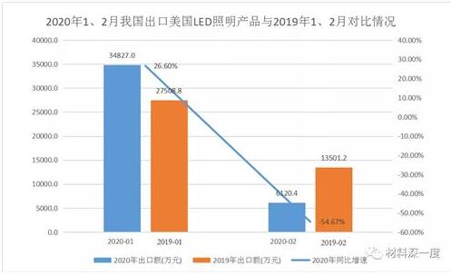 2020年前兩月我國共出口LED照明產品到(美國)共計4.09億美元,占整體出口額25.4%。今天給大家介紹一下2020年1-2月LED照明產品的出口(美國)情況。 一、對美國LED照明出口額略有下滑 據CSA Research對海關數據統計分析顯示, 2020年前兩月我國出口美國的LED照明產品共計4.09億美元,較2019年下跌了0.15%。雖然整體出口額和頭年變化不大,但每個月波動明顯,1月份上漲26.60%,但二月份受新冠肺炎疫情影響,同比下跌了54.67%。