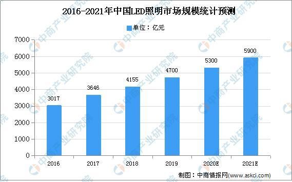 從市場規模來看,隨著國內LED照明市場滲透率快速攀升至七成以上,LED照明已基本成為照明應用的剛需,國內的LED照明市場規模呈現出較全球平均水平更快的增長勢頭。數據顯示,中國LED照明市場產值規模由2015年的2596億元增長到2018年的4155億元,年均複合增長率達到16.97%,增速高於全球平均水平。預計到2021年,中國LED照明市場產值有望達到5900億元,2019-2021年仍有望能保持超過12%的年均複合增長水平。