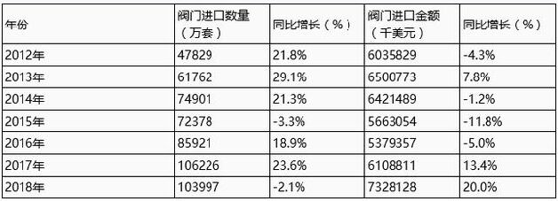 閥門作為重大技術裝備的重要組成部分,在石油、化工、冶金、長輸管線、核電、城市供排水係統等國民經濟各部門中起著關鍵作用。據中國海關發布的數據顯示,2018年1-12月,我國進口閥門103997萬套,同比下降2.1%;1-12月我國閥門進口金額為7328128千美元,同比增長20%。