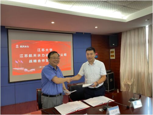 2021年7月21日,江蘇航天水力設備有限公司與江蘇大學簽署校企戰略合作協議,雙方將在校企合作、人才培養等方麵繼續深入合作,共同推動“產學研用”高質量發展。江蘇大學黨委書記袁壽其、江蘇大學能動學院黨委書記康燦、江蘇大學流體中心黨委書記張德勝等院校領導出席儀式。