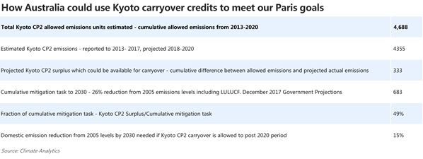 澳大利亞政府在巴黎協定框架內承諾到2030年比2005年減少二氧化碳排放26%,即6.83億噸。在目前的政策趨勢情況下,澳大利亞難以完成這個減排目標。但是,澳大利亞政府有關方麵想出了一個達標的聰明方法:用京東議定書下減排“超額”完成的減排量來補償巴黎協定下的減排目標。具體來說著這樣算的:在京東議定書下澳大利亞在2013-2020年之間被“允許”的累計排放總量為46.88億噸;而根據目前的趨勢來預測,澳大利亞在2013-2020年間的排放總量為43.55億噸,因此“超額”完成量為3.33億噸。如果把京東議定書下的“超額”完成量計入巴黎議定書下的減排量,那麼澳大利亞到2030年僅需再減排3.50億噸,也就是說到2030年比2005年減排下降15%就可以達標。