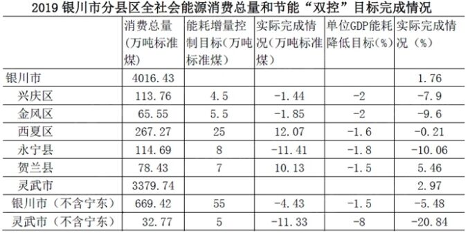 按照自治區年度考核5+1模式(寧東能耗等分項指標單列),扣除寧東,銀川市全社會能源消費量669.42萬噸標準煤,同比下降0.66%,單位GDP能耗同比下降5.48%,年度消費量增量為減少4.43萬噸標準煤,超額完成了2019年銀川市(扣除寧東)單位GDP能耗下降1.5%,能源消費增量控製在55萬噸標準煤以內的節能“雙控”目標任務。 從分縣區2019年節能“雙控”目標的完成情況看,賀蘭縣增量控製目標和單位GDP能耗下降目標均未完成,西夏區完成了增量控製目標,但未完成單位GDP能耗的下降目標,其它縣(市)區均較好的完成當年的節能“雙控”目標。