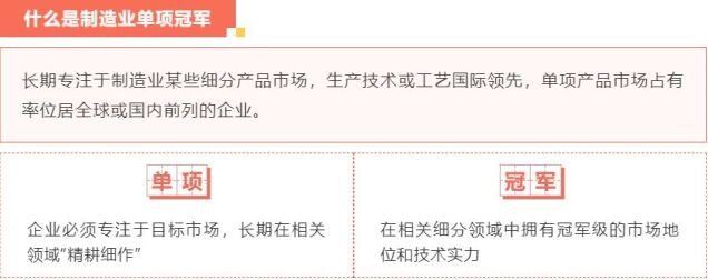 製造業單項冠軍旨在引導製造業企業專注創新和質量提升,在更多細分產品領域形成全球市場、技術等方麵領先的單項冠軍地位,提升我國製造業國際競爭力,促進我國產業整體在全球產業鏈中邁向高端。