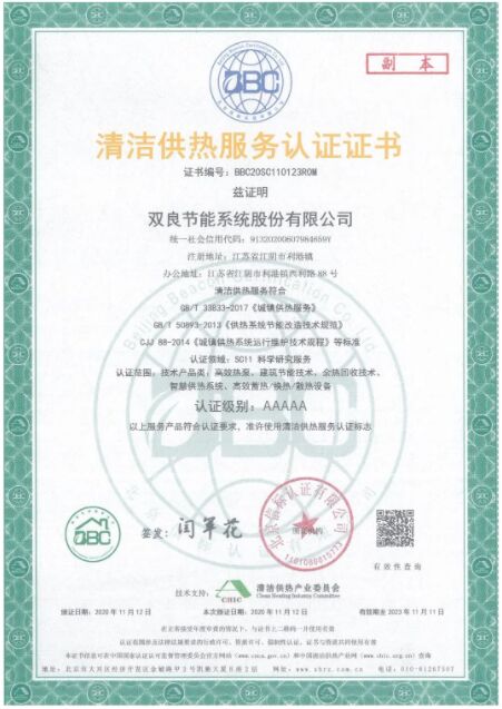 憑借多年在清潔供冷供熱領域的綜合實力,雙良節能成為首批中國清潔供熱產業“清潔供熱服務認證”5A級企業。