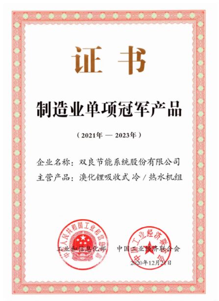 雙良溴化鋰吸收式冷/溫水機組,榮獲由工信部、中國工業經濟聯合會共同頒發的“ 中國製造業單項冠軍產品 ”證書。