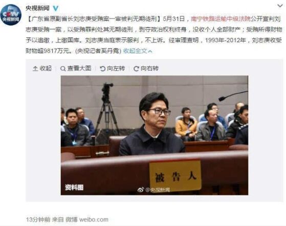 2017年5月31ri,nanningtieluyunshuzhongjifayuangongkaixuanpanguangdongshengrenminzhengfuyuanfushengchangliuzhigengshouhuiyian,duibeigaorenliuzhigengyishouhuizuipanchuwuqituxing,boduozhengzhiquanlizhongshen,bingchumeishougerenquanbucaichan;受賄所得財物予以追繳,上繳國庫。劉誌庚當庭表示服判,不上訴。