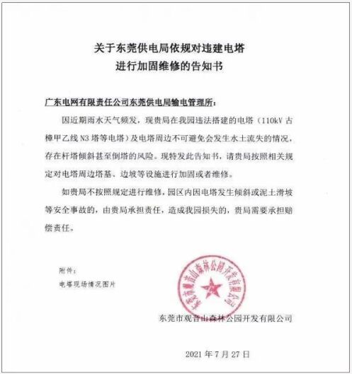 2021年7月27日ri,因yin雨yu水shui天tian氣qi頻pin發fa,加jia之zhi觀guan音yin山shan內nei的de高gao壓ya線xian的de基ji座zuo建jian設she在zai坡po地di,受shou雨yu季ji水shui土tu流liu失shi影ying響xiang的de可ke能neng性xing很hen大da,存cun在zai杆gan塔ta傾qing斜xie甚shen至zhi倒dao塔ta的de風feng險xian。這zhe種zhong現xian象xiang實shi際ji發fa生sheng後hou,觀guan音yin山shan積ji極ji要yao求qiu、發函敦促東莞供電局盡快依法依規進場按照相關規定對傾斜電塔周邊塔基、邊坡等設施進行加固或者維修。