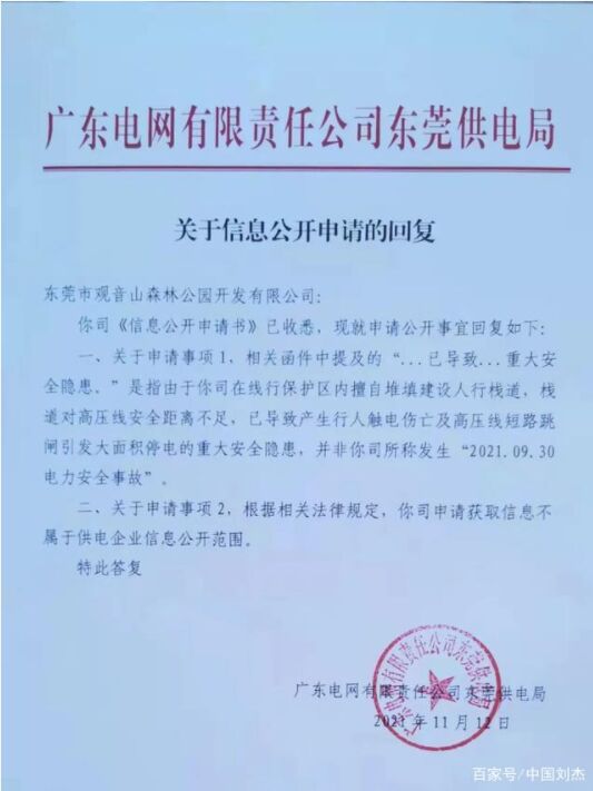 從2002年開始,東莞供電局在未經公園方同意,在審批手續的不齊全的情況下,先後將多組高壓線塔架設在觀音山國家級森林公園內到2012年6月,東莞供電局依然在未取得相關主管部門的批文或同意、且沒有公園方同意的情況下,在觀音山森林公園範圍內的山體及吉祥路兩邊,進行220千伏東莞至角布雙回送電線工程及110千伏鹿窩輸變電配套線路施工建設,毀林近百畝;再到如今2022年,僅僅一個民營企業的要解決80%區域的用電,前麵就有這麽多的“攔路虎”。這不得不說是東莞的悲哀。