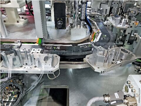 基於 XTS 係統的裝配線具有四個獨立的單元,共有 50 多個工位,用於壓合、焊接、擰緊螺絲、用 LVDT 位移傳感器檢測平麵度、點膠、等離子處理、泄漏檢測等。很多工位需要與機器人精確同步。在前三個設備單元中,操作人員將泵放在與 XTS 動子連接的托盤上。第一個單元中的 XTS 係統長 12 米,有 18 個動子;第二個單元中的 XTS 係統長 6 米,有 12 個動子;第三個單元中的 XTS 係統長 10 米,有 18 個(ge)動(dong)子(zi)。經(jing)過(guo)仔(zai)細(xi)計(ji)算(suan)的(de)托(tuo)盤(pan)間(jian)距(ju)實(shi)現(xian)了(le)微(wei)米(mi)級(ji)的(de)定(ding)位(wei)。當(dang)所(suo)有(you)裝(zhuang)配(pei)過(guo)程(cheng)完(wan)成(cheng)後(hou),操(cao)作(zuo)人(ren)員(yuan)將(jiang)泵(beng)移(yi)到(dao)下(xia)一(yi)個(ge)單(dan)元(yuan)。第(di)三(san)個(ge)單(dan)元(yuan)上(shang)的(de)小(xiao)型(xing)輸(shu)送(song)機(ji)將(jiang)泵(beng)移(yi)到(dao)第(di)四(si)個(ge)單(dan)元(yuan),在(zai)那(na)裏(li),機(ji)器(qi)人(ren)在(zai)兩(liang)個(ge) GigE 攝像機前升舉起已裝配完成的泵,進行最後的視覺檢查,然後將泵放在輸送機上送出。