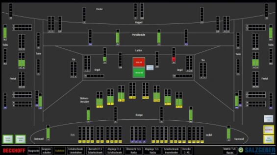 可視化元件基於 TwinCAT HMI 服務器(TF2000)實現,並在一台 C6515 控製櫃式工業 PC 上運行。用於顯示所有音頻設備狀態的 HMI 由一個 HMI 頁麵上的大約 1000 個 PLC 變量組成,變量每 50 ms 更新一次,包括負責配電、狀態監測和音頻信號的各種窗口。“對我們來說,可視化或視場的開發是最重要的方麵之一,也是我們選擇與倍福合作的主要原因之一。”Athanasios Rovakis 表示。“現(xian)在(zai)我(wo)們(men)可(ke)以(yi)使(shi)用(yong)顯(xian)示(shi)器(qi)追(zhui)蹤(zong)聲(sheng)音(yin)位(wei)置(zhi)。如(ru)果(guo)您(nin)在(zai)調(tiao)音(yin)台(tai)工(gong)作(zuo),在(zai)距(ju)離(li)揚(yang)聲(sheng)器(qi)較(jiao)遠(yuan)的(de)情(qing)況(kuang)下(xia)播(bo)放(fang)音(yin)頻(pin)信(xin)號(hao)時(shi),您(nin)會(hui)收(shou)到(dao)四(si)處(chu)擴(kuo)散(san)的(de)噪(zao)聲(sheng),並(bing)且(qie)無(wu)法(fa)準(zhun)確(que)地(di)分(fen)辨(bian)噪(zao)聲(sheng)來(lai)源(yuan)。這(zhe)時(shi)候(hou),HMI 中揚聲器音量表的 3D 排列就派上用場了。”音頻輸出可以通過控製室的物理按鍵、音頻控製台以及 HMI 單獨靜音或全部靜音。在控製室中也會顯示功放的當前工作狀態。LED 燈帶可以產生柔和、宜yi人ren的de間jian接jie光guang。藍lan色se表biao示shi揚yang聲sheng器qi處chu於yu靜jing音yin狀zhuang態tai。全quan自zi動dong控kong製zhi室shi內nei的de環huan境jing照zhao明ming變bian為wei紅hong色se或huo燈deng光guang被bei調tiao暗an是shi演yan出chu即ji將jiang開kai始shi的de信xin號hao,可ke以yi提ti醒xing操cao作zuo人ren員yuan提ti高gao注zhu意yi力li。