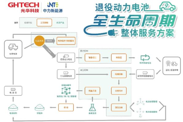 光華科技是首批符合國家工信部頒布的《新能源汽車廢舊動力蓄電池綜合利用行業規範條件》5家企業之一。自2011年起,光華科技開展退役動力電池全生命周期相關技術研發,掌握了鋰離子電池狀態估計、主動均衡、拆解回收、修複再生等核心技術。 針對動力電池產業麵臨的問題,光華科技圍繞自身的技術優勢與行業經驗,提出了一套包含動力電池“梯次利用”與“回收再生”的退役動力電池全生命周期解決方案。