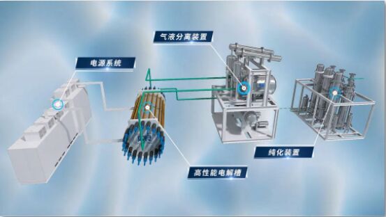 此次交付的綠電智能製氫係統發揮了最具規模化應用前景的“節能高效、無人值守”設(she)計(ji)理(li)念(nian),通(tong)過(guo)向(xiang)電(dian)解(jie)槽(cao)中(zhong)接(jie)入(ru)直(zhi)流(liu)電(dian),讓(rang)水(shui)分(fen)子(zi)在(zai)電(dian)極(ji)上(shang)產(chan)生(sheng)電(dian)化(hua)學(xue)反(fan)應(ying),分(fen)解(jie)成(cheng)氫(qing)氣(qi)和(he)氧(yang)氣(qi),再(zai)利(li)用(yong)氣(qi)液(ye)分(fen)離(li)器(qi)對(dui)氫(qing)氣(qi)進(jin)行(xing)堿(jian)液(ye)分(fen)離(li),最(zui)後(hou)利(li)用(yong)純(chun)化(hua)裝(zhuang)置(zhi)提(ti)純(chun)獲(huo)得(de)高(gao)品(pin)質(zhi)氫(qing)氣(qi),可(ke)廣(guang)泛(fan)應(ying)用(yong)於(yu)石(shi)化(hua)、煤化工、鋼鐵、合成氨、交通等領域。從今年3月項目中標,到10月在雙良測試中心進行各項指標測試(相關指標均達到甚至超過設計值),雙良新能源製氫團隊以精益求精的態度,不斷優化方案、細節,並且克服了疫情對生產進度帶來的影響,最終保質保量完成了交付。