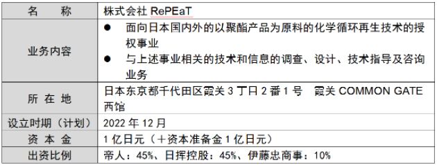 帝人株式會社(公司總部:大阪市北區、代表取締役社長兼執行董事CEO:內川 哲茂,以下稱“帝人”)、日揮控股株式會社(公司總部:橫濱市西區、代表取締役會長CEO:佐藤 雅之,以下稱“日揮HD”)、伊藤忠商事株式會社(公司總部:東京都港區、社長COO:石井 敬太,以下稱“伊藤忠商事”)以授權化學回收聚酯產品的技術為目的,就設立合資事業公司“株式會社RePEaT”(以下稱“RePEaT”)之事宜簽訂了合資合同。