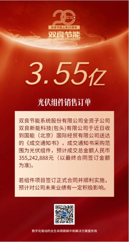 雙良節能簽訂3.55億元光伏組件銷售訂單