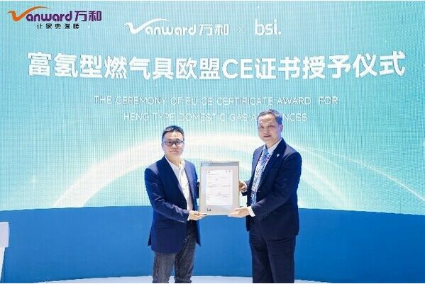 BSI 大中華區董事總經理張翼翔隨後就雙方在氫能燃氣具方麵的技術合作內容做了分享,並現場為萬和電氣隆重頒發富氫燃氣具產品 CE 證書。值得一提的是,這是BSI首次在國內頒發富氫燃氣熱水器產品證書,萬和電氣也成為國內第一家獲取該產品 CE 認證的企業,還意味萬和電氣燃氣具獲得了歐洲市場準入,將有機會進軍歐洲市場,在歐盟地區進行銷售。