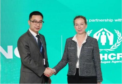 ■隆基綠能副總裁佘海峰與聯合國難民署對外關係負責人多米尼克*海德共同簽署合作協議。
