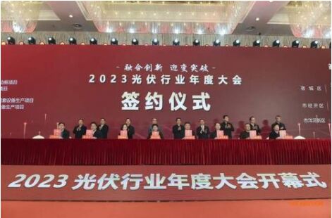本次大會分為集中活動和分項活動兩個部分。集中活動包括2023光伏行業年度大會開幕式、2023年中國光伏行業企業家座談會(第三屆理事會擴大會議)、2023光伏行業年度大會主論壇等;分項活動設置了光伏供應鏈配套發展論壇、光伏係統質量安全提升研討會等。開幕式現場,中國光伏行業協會、天合光能股份有限公司分別與宿遷市人民政府簽訂了戰略合作協議。22個項目進行簽約,協議投資430.16億元,其中50億元以上項目4個。