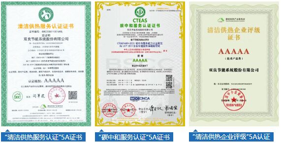 憑借多年在清潔供冷供熱領域的綜合實力,雙良節能榮獲“清潔供熱服務認證”5A證書、“碳中和服務認證”5A證書、首批中國清潔供熱產業“清潔供熱企業評級”5A級認證。