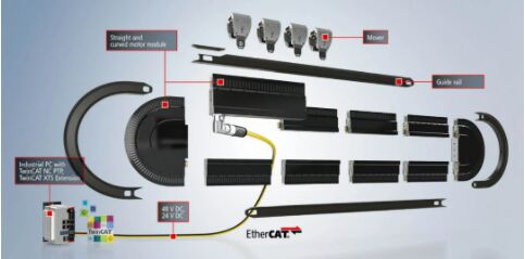 一套完整的模塊化 XTS 係統由電機模塊、導軌和動子,以及裝有 TwinCAT 自動化軟件的工業 PC 構成,可以根據具體的設備或係統布局進行調整。
