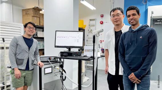 Breathonix 團隊與 Ionicon 公司的 PTR-TOF 分析儀合影:新加坡研究人員使用專用的軟件處理新冠病毒呼氣檢測的分析數據,一分鍾就能出結果。