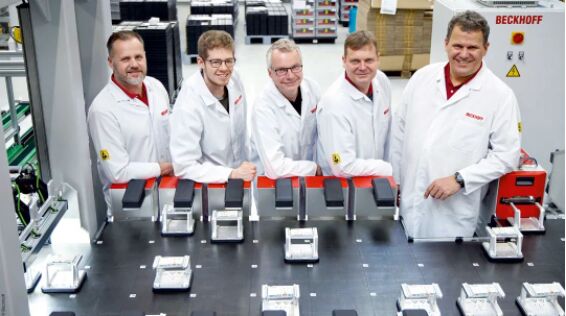 如此精密的係統隻能由一個完整的團隊進行設計和實施才能完成(倍福專家團隊,左起):Daniel Golz(機械設計)、Mathis Blattner(測試櫃軟件開發)、Ulrich Brockhaus(係統編程)、Stefan Engelke(測試設備開發)和 Michael Golz(演示係統部門主管)