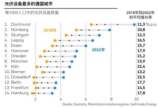 光伏係統密度最高的是多特蒙德。 每1000人中就有近10個光伏設備。 紐倫堡大約有8個,斯圖加特以7個位居第三。 值得注意的是,科隆、杜塞爾多夫和德累斯頓在過去5年間強勁增長,人均光伏數量翻了一番以上。