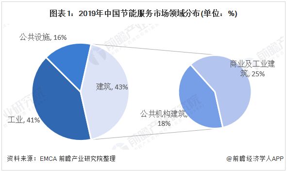 1、中國節能服務分布在工業和建築領域 根據中國節能協會節能服務產業委員會(EMCA)2019年對合同能源管理項目進行調查分析的結果顯示,按照節能三大領域分類,工業領域項目有項目總數的41%;建築領域項目有占項目總數的43%,其中公共機構建築18%,商業及工業建築25%;公共設施項目項目總數的16%。
