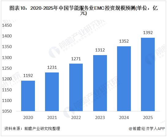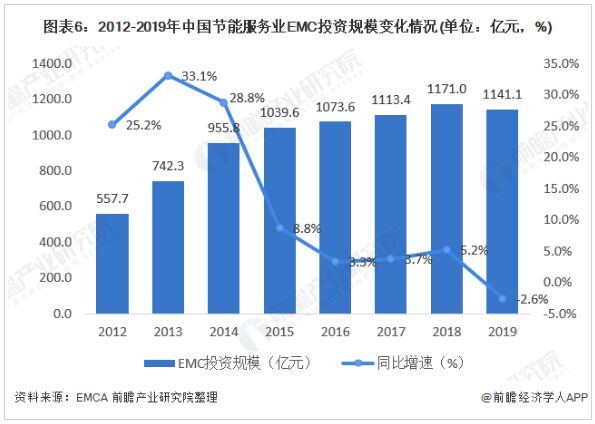 能neng源yuan業ye作zuo為wei民min生sheng行xing業ye,多duo被bei國guo企qi和he央yang企qi掌zhang握wo,而er節jie能neng服fu務wu作zuo為wei能neng源yuan業ye的de衍yan生sheng行xing業ye則ze多duo由you民min企qi占zhan據ju,由you此ci節jie能neng服fu務wu行xing業ye涉she及ji到dao國guo家jia和he民min營ying公gong司si的de合he作zuo。 2018年11月9日,財政部發布了提前下達2019年普惠金融發展專項資金預算指標的通知,通知指出政府和社會資本合作(PPP)項目以獎代補政策由於已到執行期限,將不再下達相應預算指標。 由此2019年中國節能服務EMC投資規模下滑2.6%。但是根據前文的分析,節能服務主要應用在建築行業和工業行業,而據調查,近5年,我國建築業和工業的平均增加值增速保持在5%以上。 由此可推出2019年中國節能服務的負增長可能是由於供給側改革政策和取消PPP項目以獎代補政策的疊加所致,前瞻預計2020年後節能服務行業EMC投資額仍將保持正增長,但增長速度將低於5%,到2025年達到約1392億元。