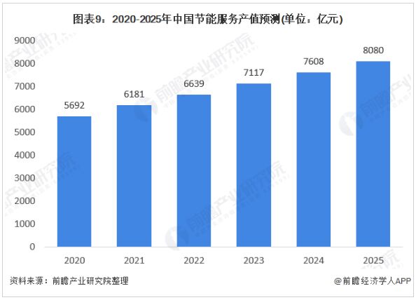 2019年EMCA的數據顯示,我國節能服務產業總產值從2012年的1653億元增長到2019年5222億yi元yuan,增zeng長chang速su度du持chi續xu下xia降jiang。近jin幾ji年nian來lai,我wo國guo節jie能neng服fu務wu產chan業ye利li好hao政zheng策ce頻pin發fa,加jia上shang國guo家jia對dui節jie能neng環huan保bao的de重zhong視shi程cheng度du不bu斷duan加jia深shen。從cong長chang遠yuan來lai看kan,未wei來lai隨sui著zhe節jie能neng服fu務wu產chan業ye規gui模mo的de不bu斷duan擴kuo大da,其qi發fa展zhan速su度du將jiang隨sui著zhe行xing業ye不bu斷duan的de接jie近jin飽bao和he發fa展zhan而er放fang緩huan,到dao2025年,全國節能服務產業總產值將約達到8080億元。