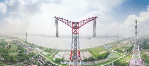 4月15日,這是導線展放後的昌古特高壓長江大跨越工程北岸跨越塔。當天,世界電壓等級最高的特高壓大跨越――昌古特高壓長江大跨越工程全線貫通。