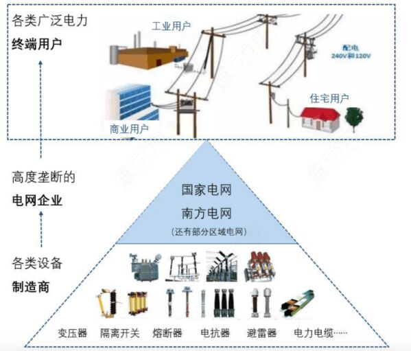 電網產業鏈下遊是廣泛的終端用戶,電網企業提供輸送電服務,用戶向電網企業支付電費(目前電網企業仍然是最主要的售電主體),根據電價的差異,大致可以將用戶分為:大工業、一般工商業、居民以及農業生產四類,其中大工業和一般工商業用戶對應的電價高於居民和農業生產用電價。 中遊是電網建設及運營,傳統模式下電網企業進行網架建設投資,通過購售電價差,收回投資及賺取收益。 電網的上遊包括建設環節的設備企業和運營環節的發電企業。其中電力設備企業不僅有硬件設備,也包括軟件,係統集成等。