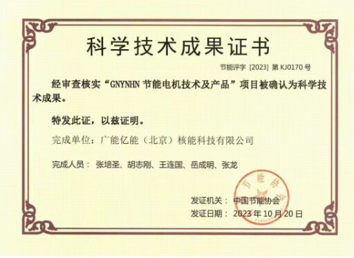 創新驅動發展,科技成就未來。廣能億能(北京)核能科技有限公司“GNYNHN節能電機技術及產品”被中國節能協會認定為科學技術成果,標誌著廣能億能核能的節能電機技術邁上了一個新台階。
