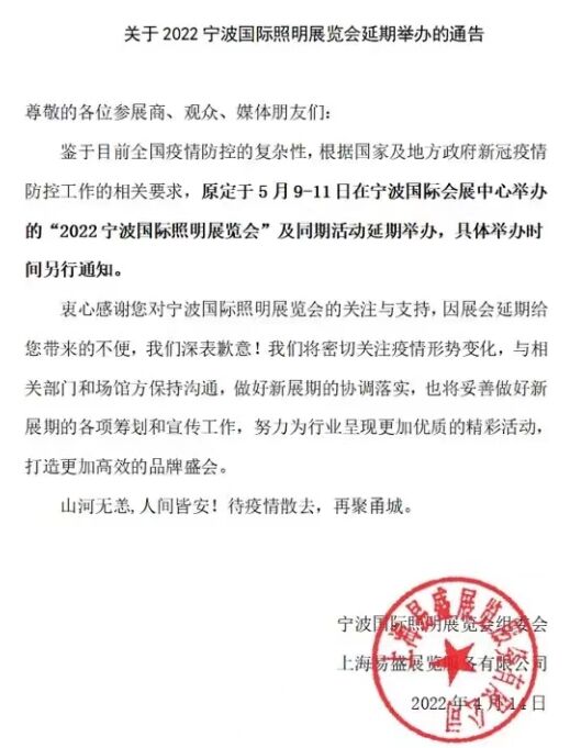 鑒於目前全國疫情防控的複雜性,根據國家及地方政府新冠疫情防控工作的相關要求,原定於5月9-11日在寧波國際會展中心舉辦的“2022寧波國際照明展覽會”及同期活動延期舉辦,具體舉辦時間另行通知。