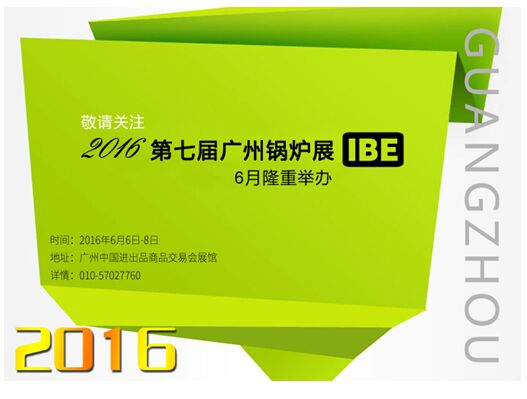 2016第七屆廣州鍋爐展暨:2016第七屆中國國際節能環保鍋爐展覽會(簡稱IBE),由中國低碳產業協會環保鍋爐委員會發起;擬邀8家行業權威組織機構:1萬平米展出麵積,300餘家優秀廠家、2萬專業觀眾即將於2016年6月6日-8日集聚廣州•中國進出品商品交易會展館。 目前組委會已開放在線登陸平台,需要了解項目的企事業單位及個人均可通過登陸:http://www.guoluzhan.com/6/cgdj.asp進行免費參觀登記,需要發布項目的廠家也可以登陸http://www.guoluzhan.com/6/czdj.asp進行展位預選提交。詳情谘詢:010-57027760,敬請關注!