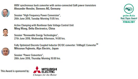 PCIM Asia 2018 國際研討會獎項入圍名單 研討會每年設立“最佳論文獎”和“青年工程師獎”兩大獎項,以表彰在電力電子行業的技術研究、市場趨勢預測及政策倡議上都有卓越貢獻之傑出人士。 最佳論文獎